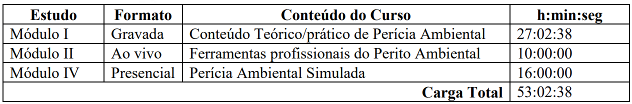 Apresentação do curso; Contextualização Universidade x Mercado de Trabalho; Marketing do Profissional Engenheiro Ambiental; Legislação ambiental relacionada à prática da perícia; Áreas de Atuação do Engenheiro Ambiental e Sanitarista; Perícia Ambiental como uma importante área de atuação Profissional; Tipos de Perícia Ambiental; Como me tornar Perito; Ética e Perfil Profissional do Perito Ambiental; Cadastro no Sistema Judiciário do Perito Ambiental; Nomeações, aceites, recusa e honorários; Prazos da Perícia Ambiental; Análise do processo e saída para a perícia; Direito Ambiental; Legislação Ambiental; Legislação Civil Criminal; Sensoriamento Remoto; Georreferenciamento; Levantamentos e metodologias de campo; Valoração de Danos Ambientais; Avaliação de Impactos Ambientais; Laudo Pericial; Etapas da Perícia; Fluxograma da Perícia. Direito Ambiental; A perícia ambiental como uma atividade específica; Estudos de casos; Elaboração do laudo pericial.