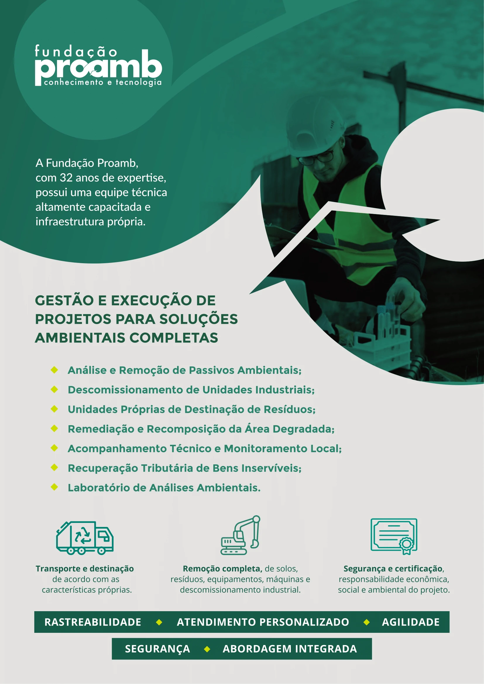Ainda, temos no escopo soluções no gerenciamento de áreas degradadas, estudo de índice de risco, assessoria e consultoria ambiental. Com esse assessoramento, as empresas desenvolvem práticas preventivas, ambientalmente responsáveis e impulsionadoras do desenvolvimento econômico sustentável.